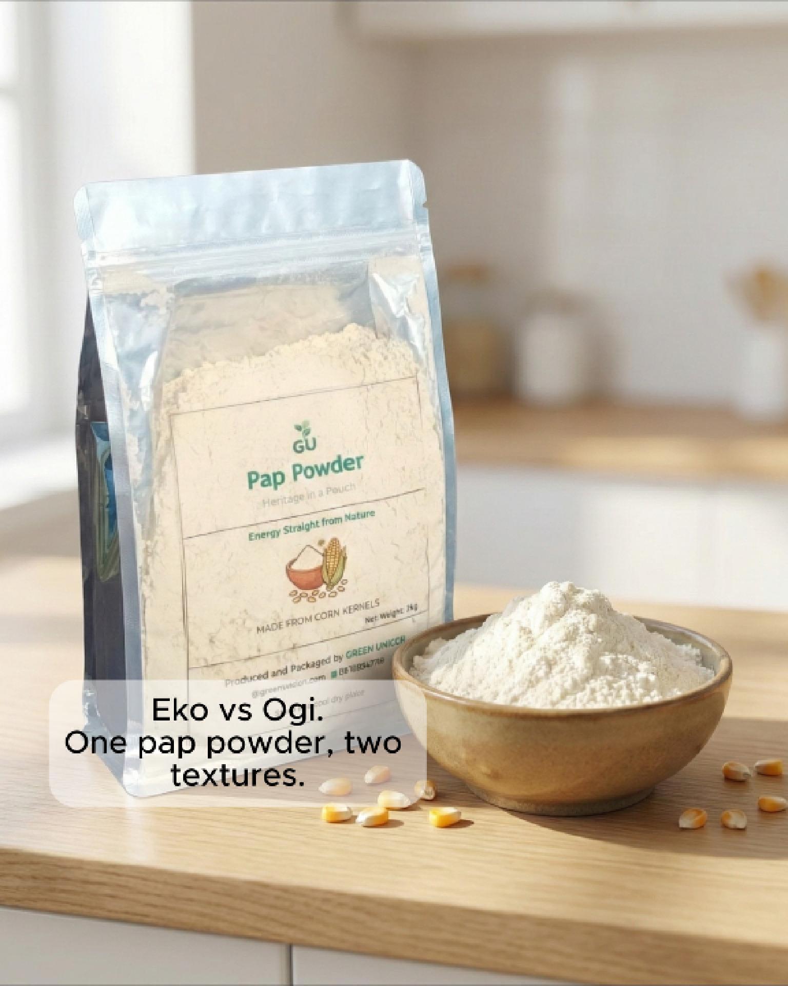 Both newbies and seasoned pap-makers can appreciate the convenience of a good pap powder. Traditionally, preparing ogi from scratch meant soaking corn for 2-3 days, grinding and sieving it, and fermenting the extract – a labor of love that many of us simply don’t have time for. Green Unison’s Instant Pap Powder takes the hassle out while keeping the authentic taste. It’s made from 100% fermented cornno preservatives – and finely milled for a lump-free mix. Essentially, we’ve done the heavy prep ahead so you can just mix, cook, and enjoy in minutes.