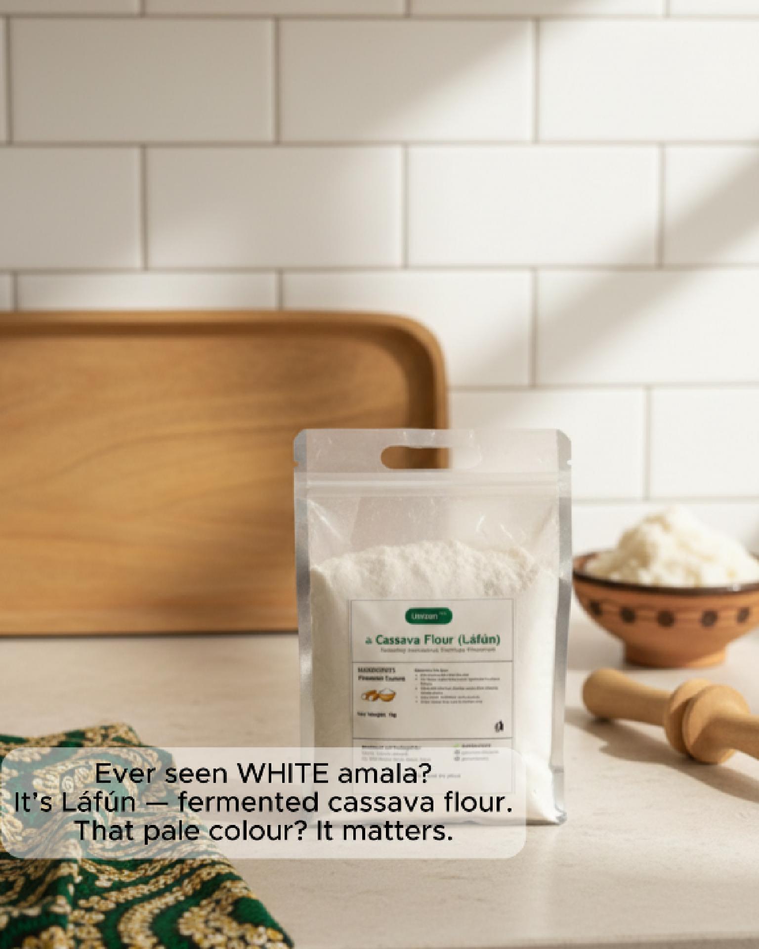 • White amala (lafún): Creamy off-white in colour when cooked, made from fermented cassava flour. Its light hue comes from using peeled and sun-dried cassava. Lafún has a slightly tangy aroma from fermentation, which many have grown to love with rich soups.